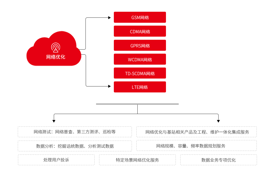 公司具有專業(yè)的網絡優(yōu)化分析團隊,具備多廠家、多運營商的綜合性網絡優(yōu)化能力,針對GSM、CDMA、TD-SCOMA、WCDMA、LTE等多種制式的無線網絡,提供整體的優(yōu)化解決方案,包括建網初期相后期擴容工程的工程網絡優(yōu)化服務、運維期間的日常網絡優(yōu)化服務、階段性分析解決網絡瓶頸的專項網絡優(yōu)化服務,通過測試數(shù)據分析、話統(tǒng)數(shù)據分析,結合天饋線系統(tǒng)優(yōu)化、無線參數(shù)優(yōu)化話務均衡等方式,對網絡性能指標進行優(yōu)化提升,最終達到提高網絡質量以滿足終端用戶需求及提升網絡設備利用率的效果。